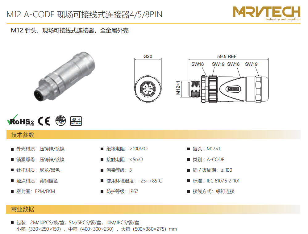 M 12針A-CODE現場配線可能コネクタ-全金属ケース