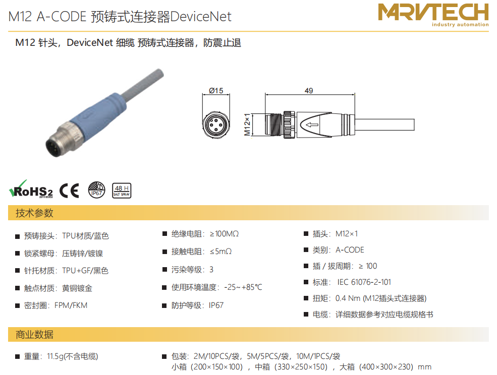 M 12ピン-DeviceNetケーブルプレキャストコネクタ-防振後退防止
