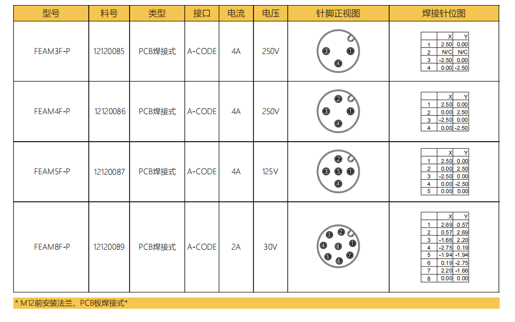 M 12ピン-フランジコネクタ-フロントマウント-PCB溶接式