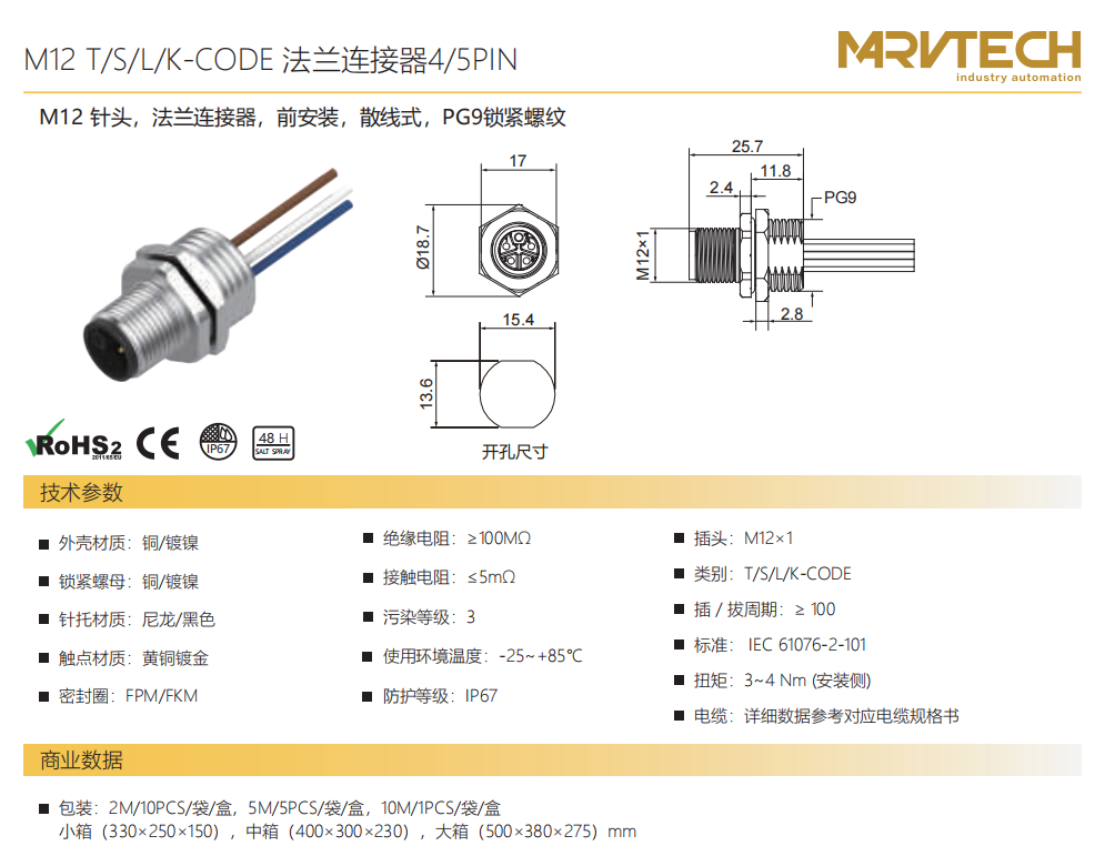 M 12ピン-フランジコネクタ-前付け-PCB溶接式-5 PIN