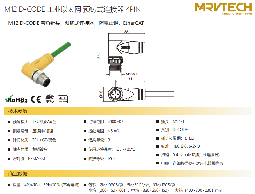 M 12-D-CODE-曲げ角-針-プレキャストコネクタ-防振後退止め-4 PIN