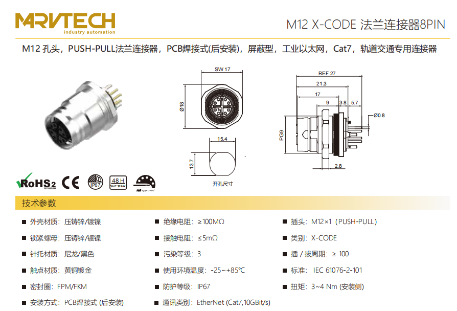 M 12-オリフィス-PUSH-PULLフランジコネクタ-PCB溶接式(後取付け)-シールド型-工業イーサネット-軌道交通専用コネクタ-8 PIN