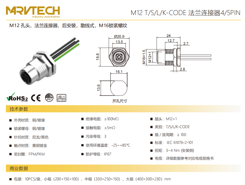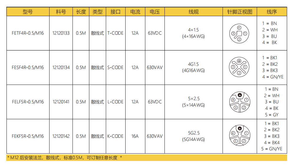 M 12-口金-フランジコネクタ-後付け-散線式-6/8/12 PIN