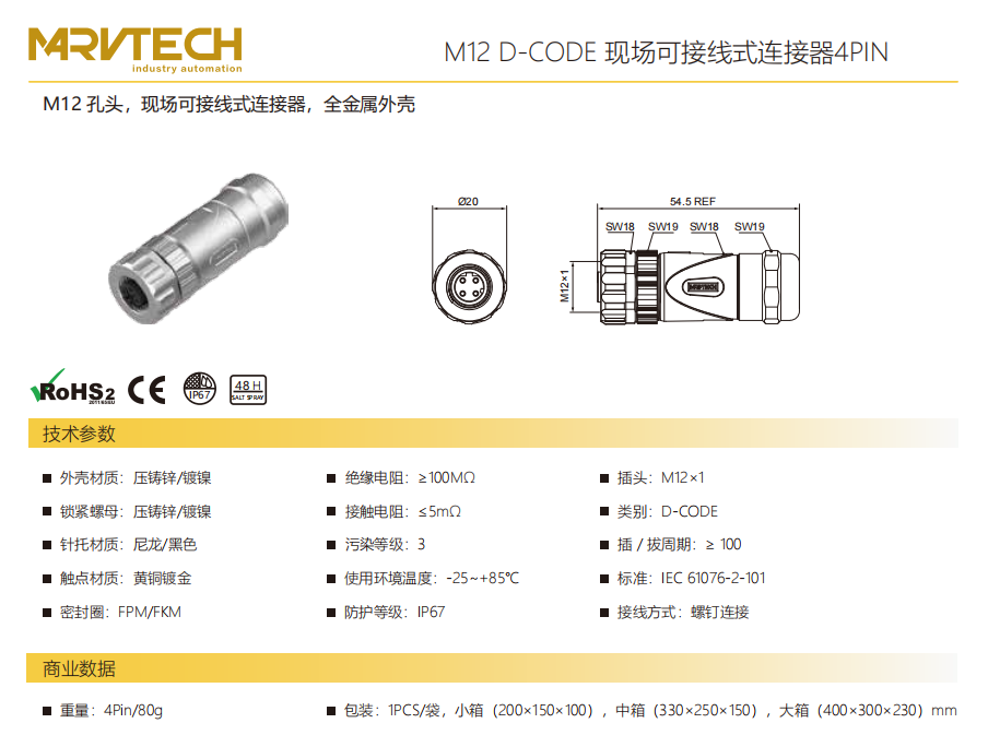 M 12-口金-現場配線可能コネクタ-全金属ケース-4 PIN
