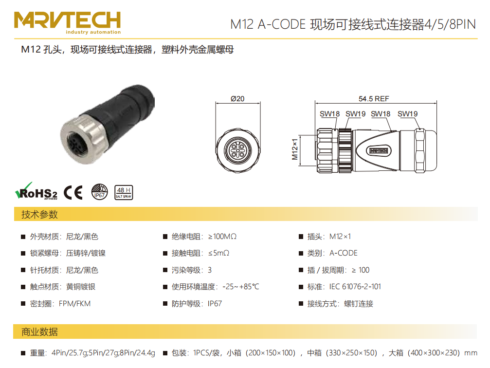 M 12-口金-現場配線可能コネクタ-プラスチックケース金属ナット-4/5/8 PIN