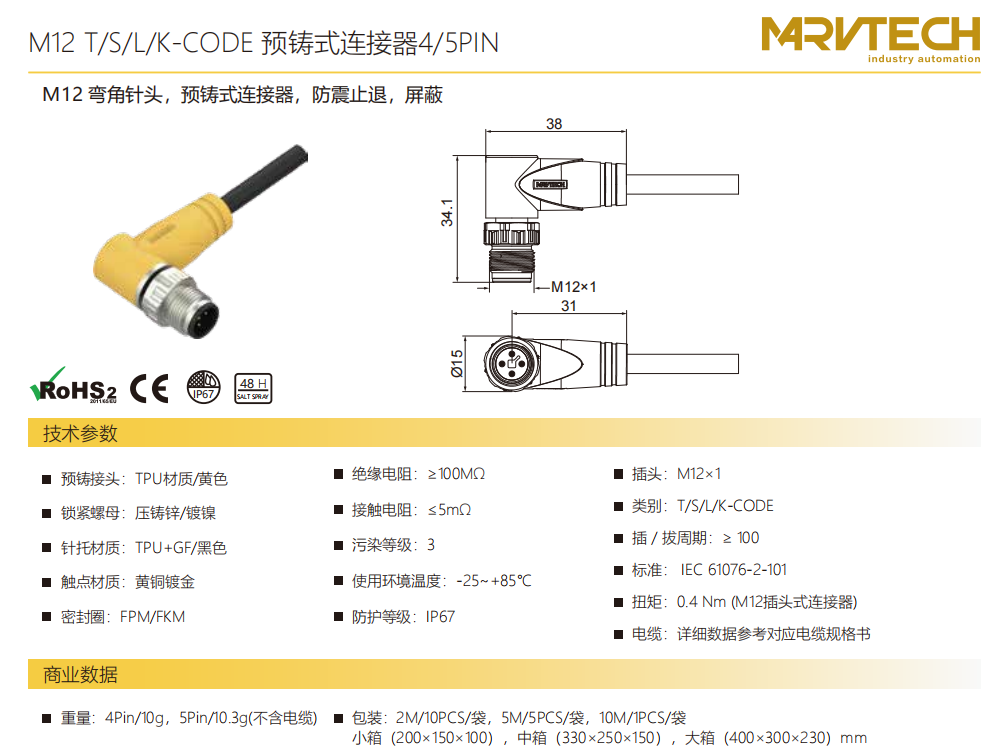 M 12-コーナーニードル-プレキャストコネクタ-防振後退防止-シールド-4/5 PIN