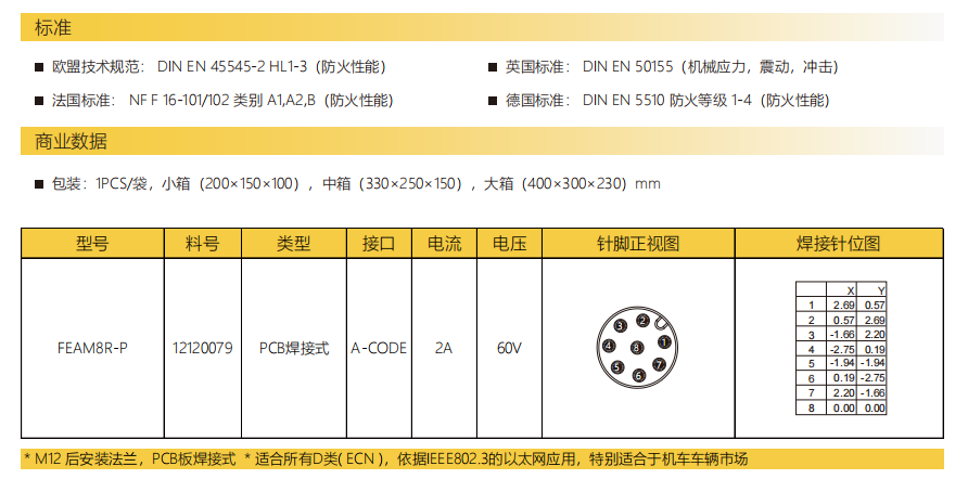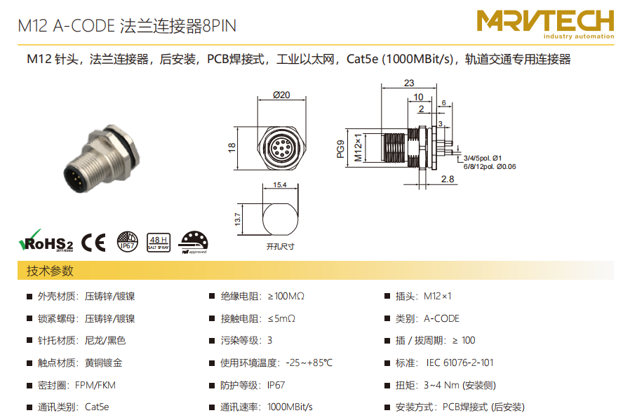 M 12-ニードル-フランジコネクタ-後付け-PCB溶接式-工業イーサネット-軌道交通専用コネクタ-8 PIN