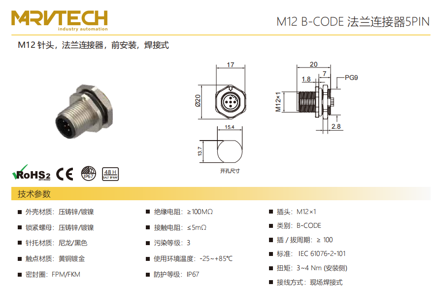 M 12-ニードル-フランジコネクタ-フロントマウント-PCB溶接式-3/4/5/8 PIN