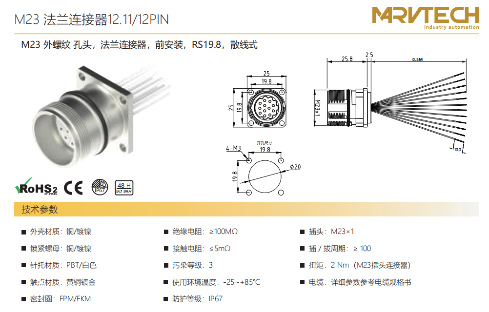 M 23雄ねじ-口金-フランジコネクタ-前取付-RS 19.8-散線式12.11/12 PIN
