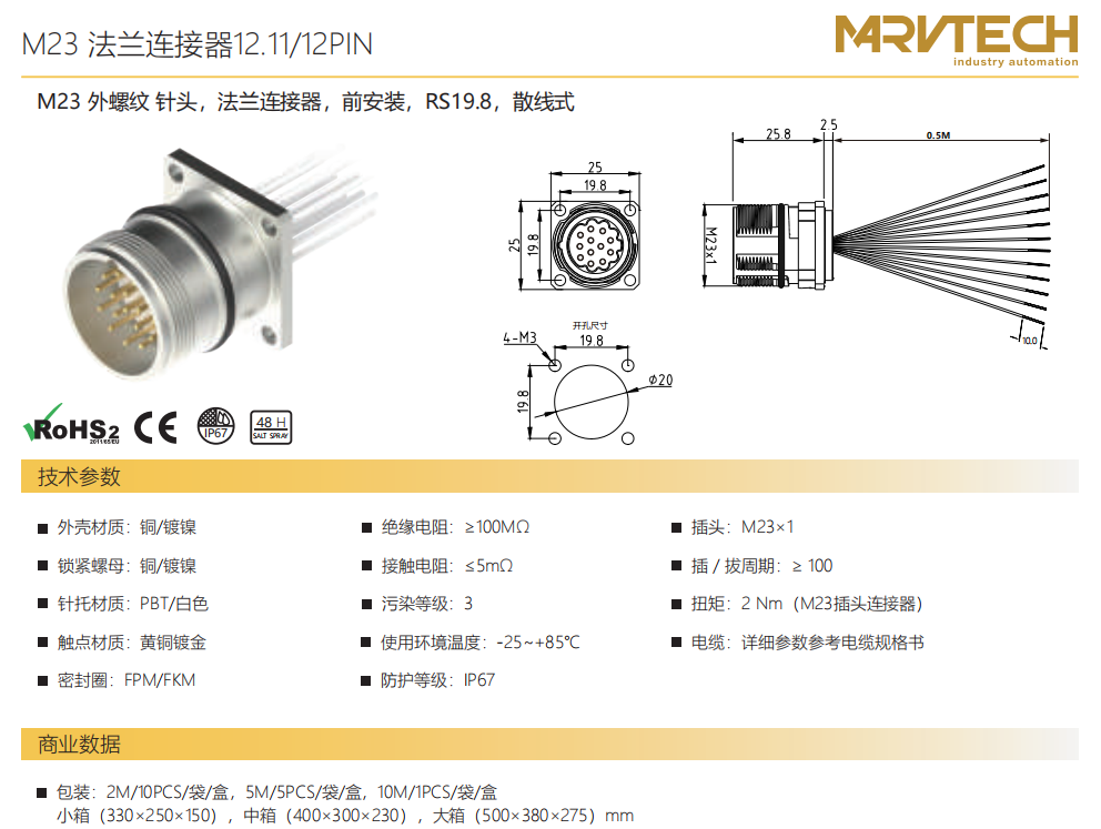 M 23雄ねじ-針-フランジコネクタ-前取付-RS 19.8-散線式12.11/12 PIN
