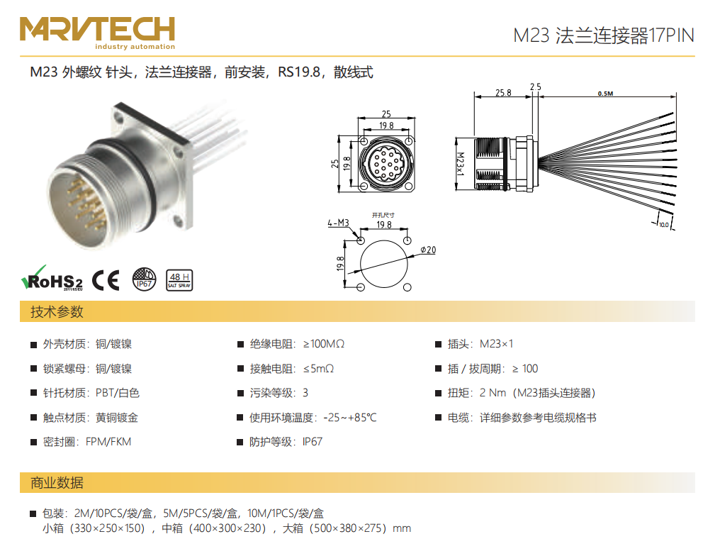 M 23雄ねじ-針-フランジコネクタ-前取付-RS 19.8-散線式19.15 PIN