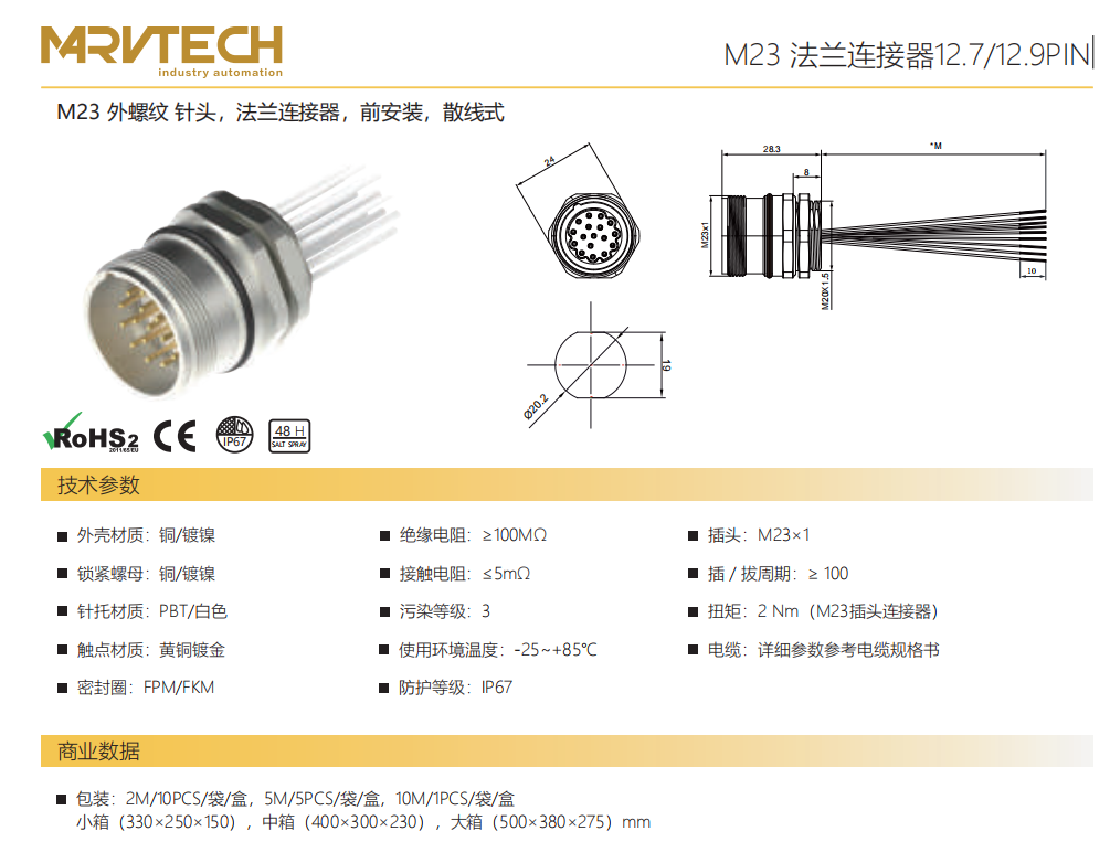 M 23雄ねじ-針-フランジコネクタ-前取付け-散線式12.7/12.9 PIN