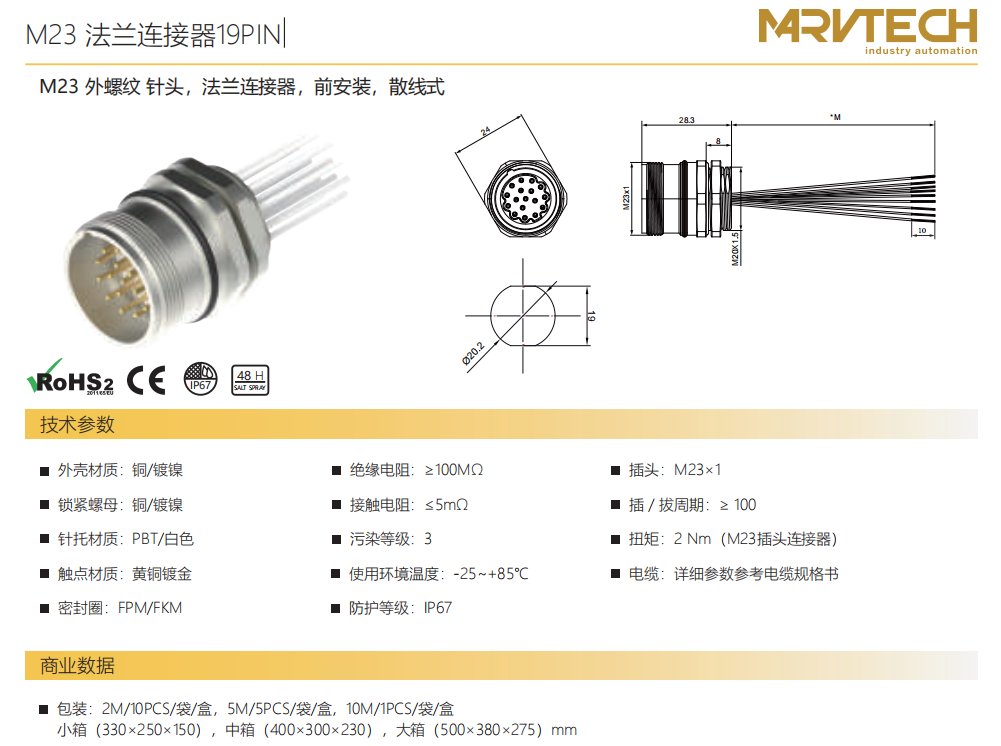 M 23雄ねじ-針-フランジコネクタ-前取付-散線式19 PIN