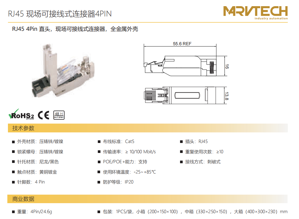 RJ 45 4 Pinストレートヘッド-フィールド結線可能コネクタ-フルメタルハウジング