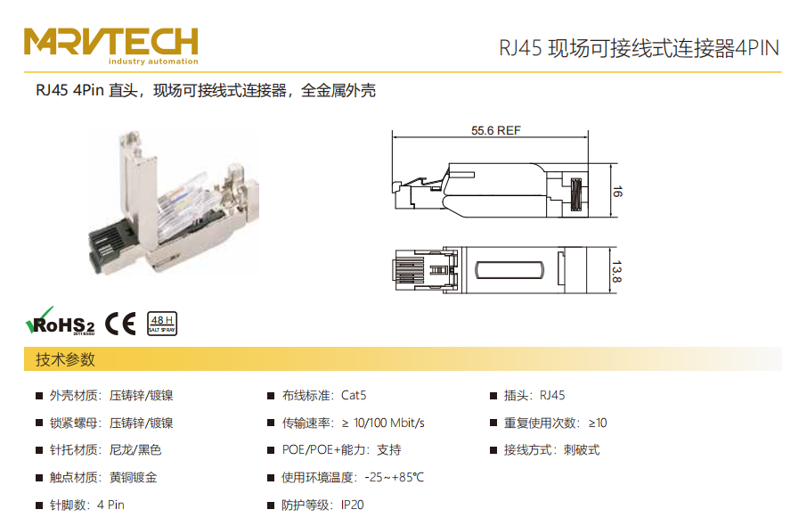 RJ 45-4 Pin-ストレートヘッド-フィールド結線可能コネクタ-フルメタルハウジング-4 PIN