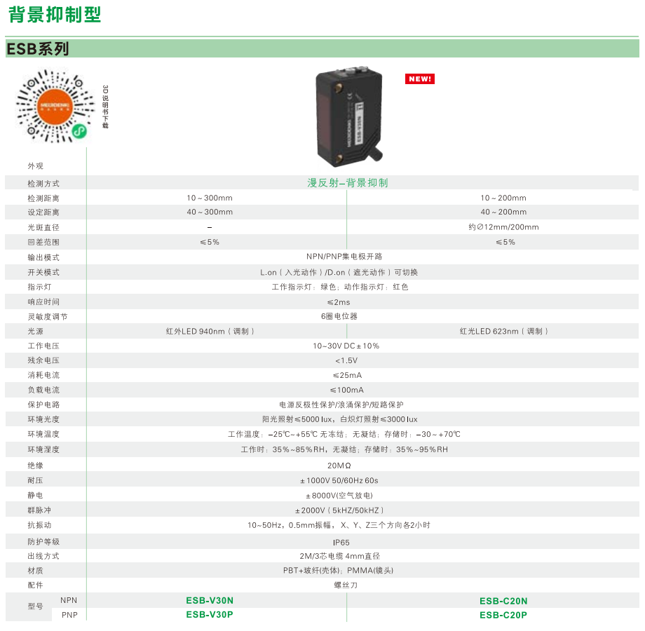 光電センサ-背景抑制型-ESBシリーズ-拡散反射-2 M/3コアケーブル-4 mm直径