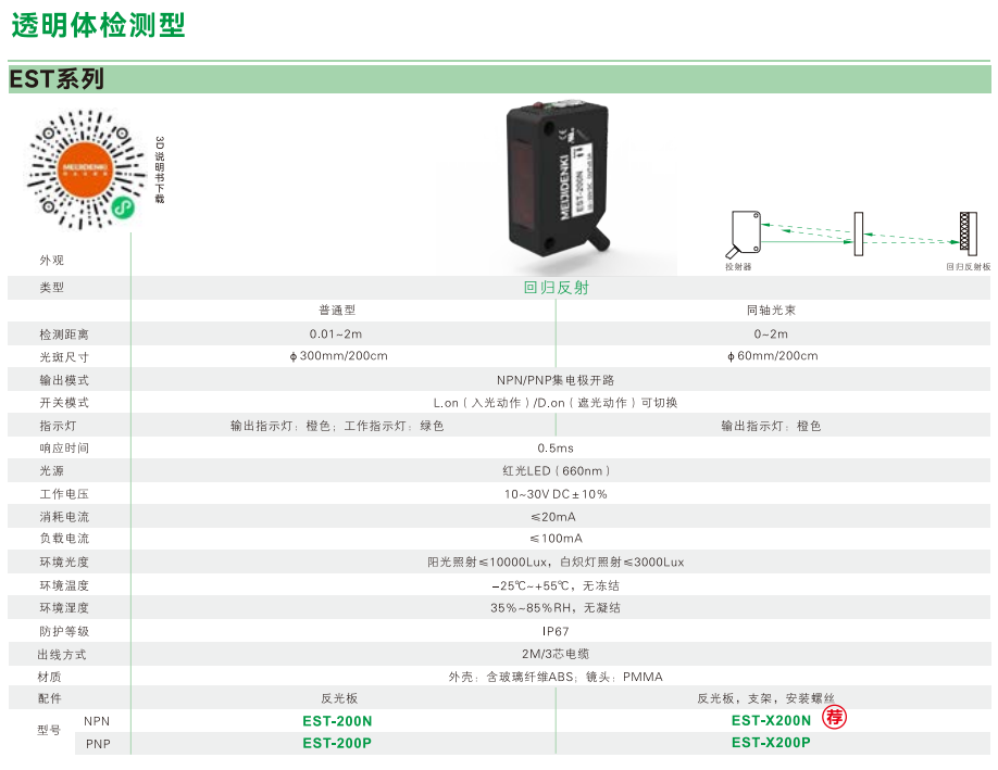 光電センサー-透明健康診断型-ESTシリーズ-回帰反射-2 M+3芯ケーブル