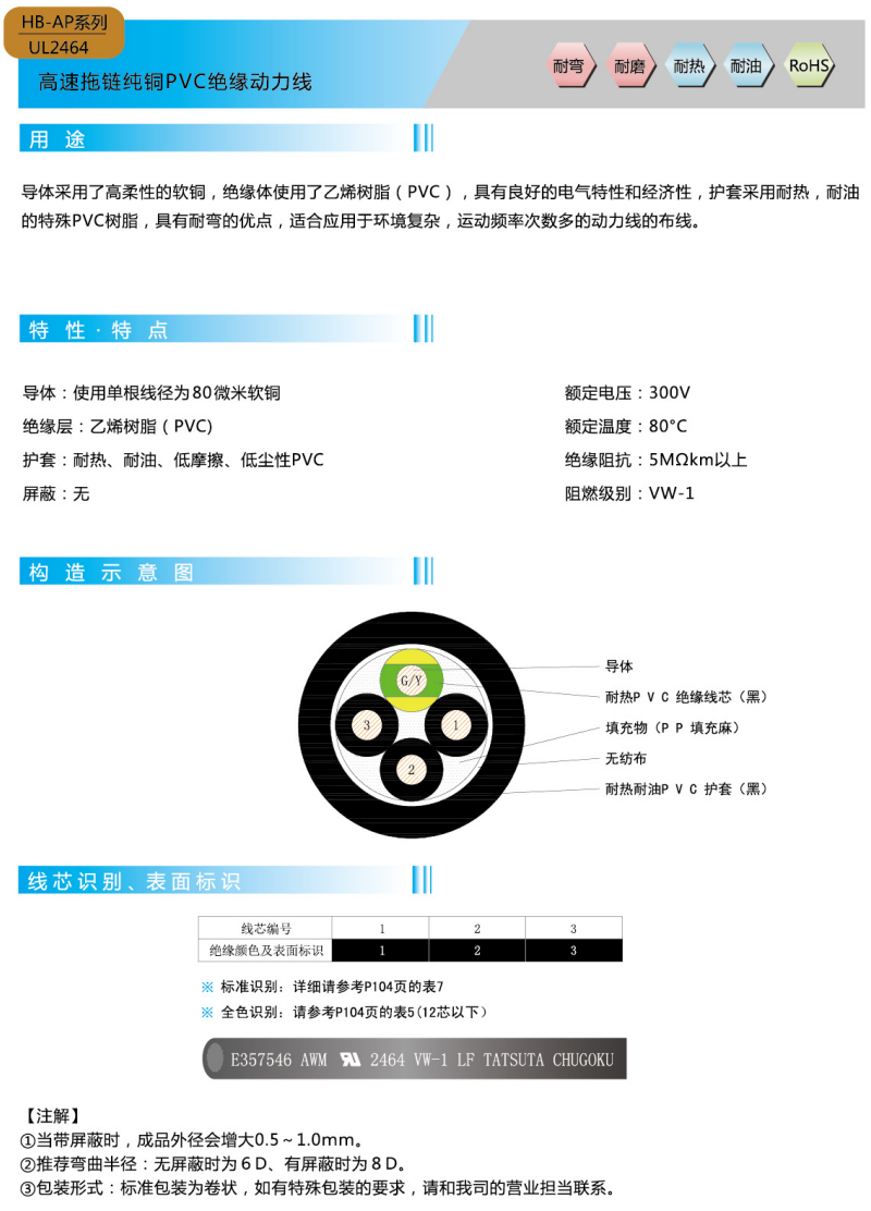 高速ドラグチェーン純銅PVC絶縁動力線01-UL 2464