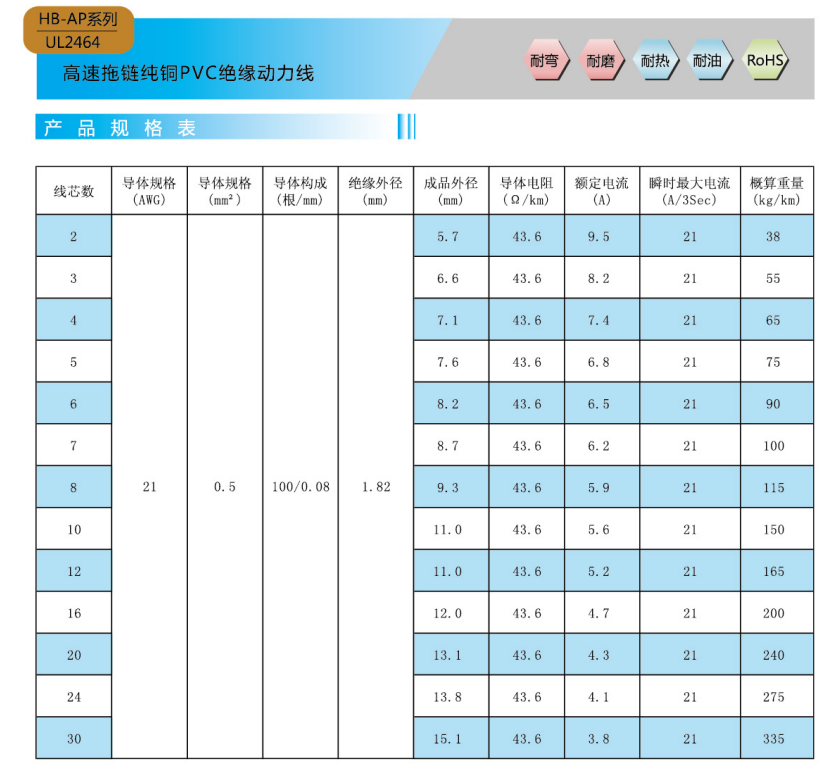 高速ドラグチェーン純銅PVC絶縁動力線02-UL 2464