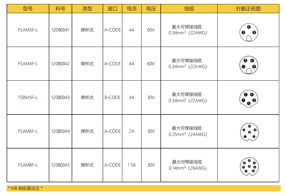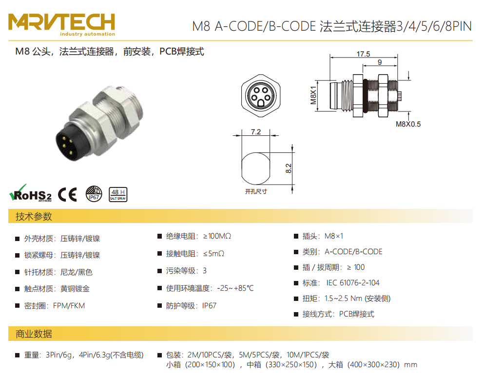 M 8オス-フランジコネクタ-フロントマウント-PCB溶接式-34568 PIN